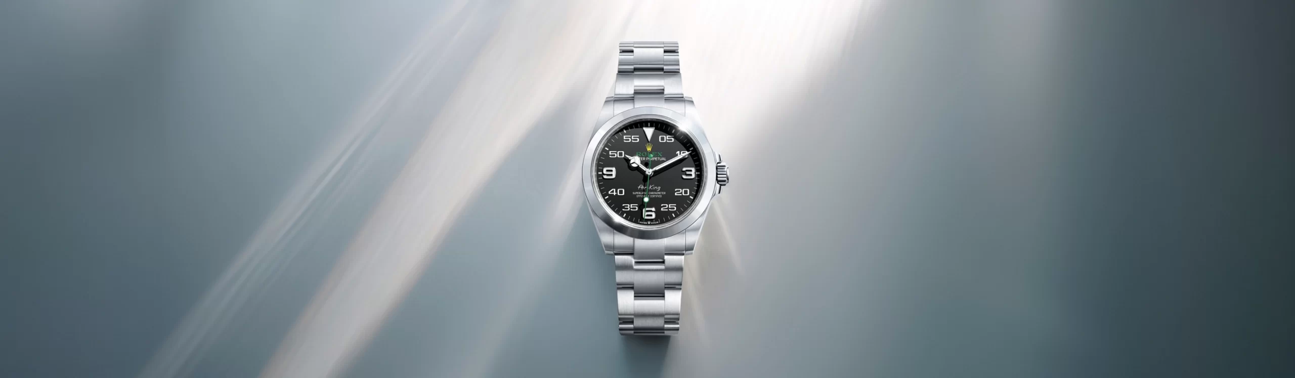 Oyster Perpetual Air-King เป็นนาฬิกาที่ได้รับการสืบทอดคุณสมบัติที่เกี่ยวข้องกับการบินมาจากนาฬิกา Oyster รุ่นดั้งเดิม และเป็นนาฬิกาที่ยกย่องและเชิดชูผู้ที่ทำให้ท้องฟ้าเป็นเขตแดนใหม่ของการผจญภัย การสำรวจ และความสำเร็จในการสร้างอุดมคติใหม่ๆ
