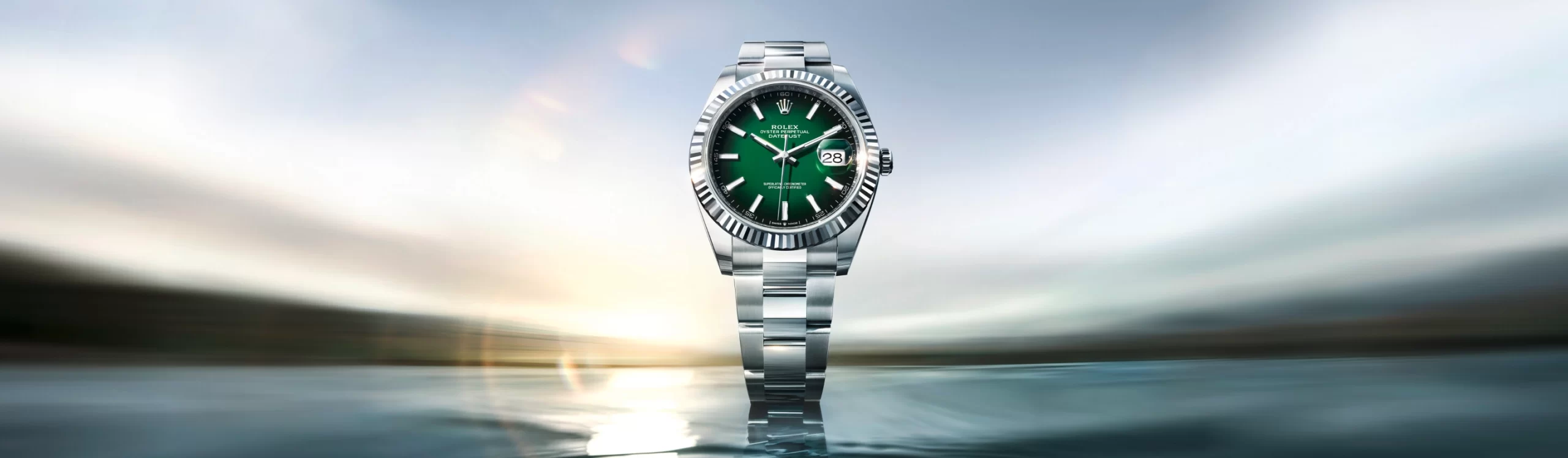 นาฬิกา Datejust 41 ผสานเอกลักษณ์โดดเด่นต่างๆ ของแบรนด์ไว้ร่วมกันอย่างกลมกลืน ไม่ว่าจะเป็นขอบตัวเรือนแบบเซาะร่อง สีเขียวอันโดดเด่น สตีลคุณภาพชั้นยอด และทองคำขาวล้ำค่า