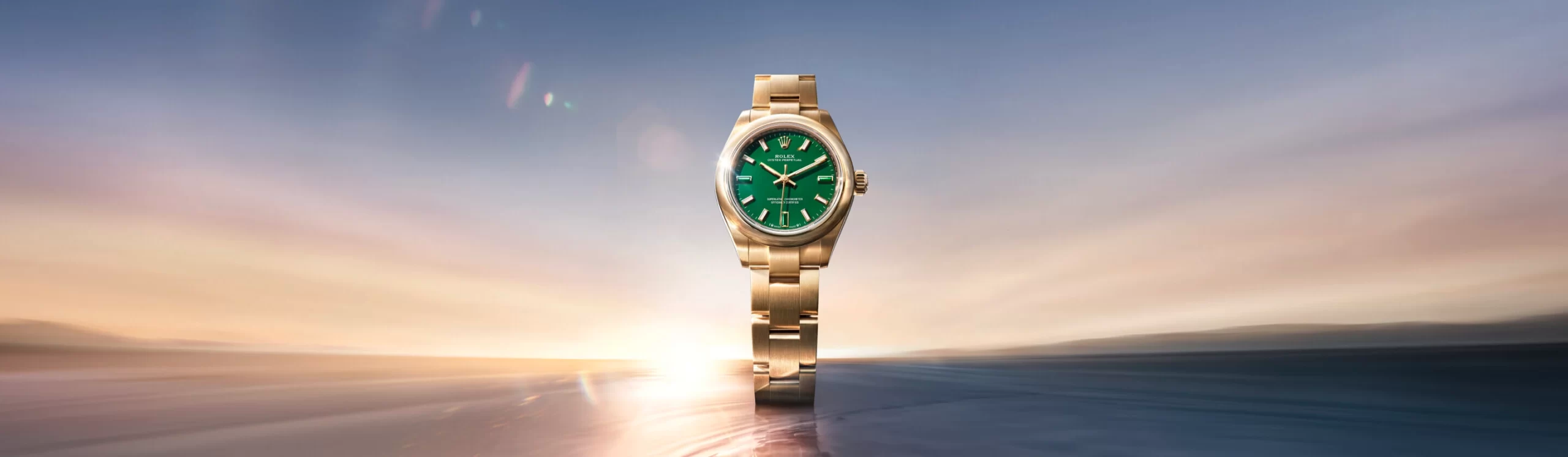 Oyster Perpetual 28 เวอร์ชันทองคำ 18 กะรัตที่มาพร้อมหน้าปัดกรีนสโตนเคลือบเงานั้น มาพร้อมเครื่องหมายบอกชั่วโมงทั้งสามตำแหน่งที่ประดับหินเฮลิโอโทรป ซึ่งเป็นหินที่มีสีเขียวหลายเฉด ส่วน Oyster Perpetual 34 รุ่น Everose gold 18 กะรัตที่มาพร้อมหน้าปัดบลูสโตนเคลือบเงานั้น มาพร้อมการประดับหินดูมอร์เทียไรต์ ซึ่งเปี่ยมเสน่ห์แห่งความงดงามในสีโทนน้ำเงินอ่อนและเข้มที่ไล่เรียงกัน